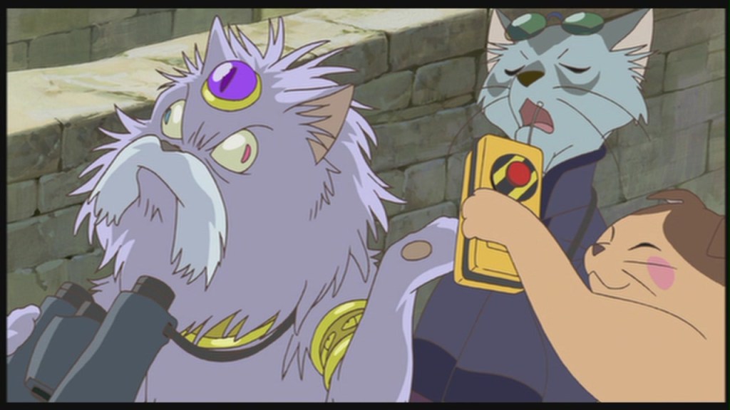 Disoriented by her transformation, Haru finds herself gloomily accepting her new life, until the Baron breaks in to rescue her. A passing friendship she almost turned down has come into this foreign land to bring her back. Does Baron assert his worldview onto Haru’s new life style? Yes, because she is not where she belongs. How does the Cat King feel about this? He’s outraged. He doesn’t want anyone leaving his kingdom. To secure Haru’s permanent place the king wants her to marry his son and if she won’t then she’ll marry the king himself! Haru of course by this point wants to return with Baron to her world and rebukes the king to his face. What caught my attention here was the subtle censorship in the English dialogue. While the subtitles read “you crazy king” the Japanese word Haru uses means “pervert.” It is the king’s lust that has driven him crazy.